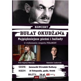 bilety: Zapraszamy na koncert pełen emocji i wzruszeń, podczas którego usłyszycie Państwo najbardziej znane, najpiękniejsze i kultowe wręcz ballady Bułata Okudżawy, jak np.: Pieśń gruzińską, Piosenkę o niebieskim baloniku, Modlitwę - Dopóki ziemia kręci się, Trzy miłości, Piosenkę o młodym ułanie, Ostatni trolejbus, Puszkina, Małą orkiestrę nadziei, Pieśń o żołnierskich butach, i wiele innych doskonale znanych i lubianych piosenek. Czeka Państwa 80 minut wzruszeń, zadumy, uśmiechów, oraz niesamowitych emocji przekazywanych w najlepszym poetyckim, aktorskim i muzycznym wydaniu. PIRAMIDY - formacja powstała w 2009 roku w Gdańsku, nazwana od jednego z wierszy Juliusza Słowackiego pt. "Rozmowa z piramidami". Oprócz koncertów w Polsce, PIRAMIDY koncertowały w USA, m.in. w Los Angeles, Las Vegas, w San Diego, w Laguna Hills, Yorba Linda, w El Cajon, w Meksyku, PIRAMIDY odwiedziły także większość krajów Europy koncertując dla Polonii zagranicznych, najważniejsze koncerty odbyły się m.in. wspólnie z Budką Suflera w ich pożegnalnej trasie w Fontanehaus w Berlinie, a także: w Columbiahalle, w Kolonii, w Monachium, w Hannoverze, w Luksemburgu, w Hadze w Holandii, w Genewie w Szwajcarii w Stałym Przedstawicielstwie ONZ, w Zurichu, na Litwie - w Wilnie i Solecznikach, w Moskwie w Sali koncertowej im. Piotra Czajkowskiego i wielu innych miejscach. Prapremiera ich autorskiej płyty "Rok wojny" odbyła się w Brunssum przy granicy holendersko - niemieckiej, w bazie wojskowej NATO dla kadry żołnierzy dowodzących misją w Afganistanie. PIRAMIDY to formacja znana także z bardzo różnych stylów muzycznych i różnych projektów - w tym teatralnych i filmowych, zespół często akompaniuje polskim aktorom, współpracuje z wytwórniami filmowymi oraz układa muzykę do słuchowisk i audiobooków. W dorobku zespołu znaleźć można pięć autorskich płyt, jak też kilka płyt skomponowanych i napisanych dla innych wykonawców, m.in. dla aktora Krzysztofa Tyńca. Program "Najpiękniejsze pieśni i ballady Bułata Okudżawy" wykona zespół PIRAMIDY w składzie: Radosław Laskowski Piramidy artyści: Piotr Kajetan Matczuk, Radosław Laskowski, Tomasz Imienowski,"Najpiękniejsze piosenki z polskich filmów i seriali" to najnowszy koncert zespołu Piramidy, który zasłynął na całym świecie brawurowymi interpretacjami piosenek Bułata Okudżawy i Włodzimierza Wysockiego. W tym koncercie powrócicie Państwo do najbardziej znanych i lubianych ballad, melodii i piosenek filmowych jak np.: "Prawo i pięść", "Czarne chmury", "Jan Serce", "Noce i dnie", "Stawka większa niż życie", "Polskie drogi", "Kariera Nikodema Dyzmy", "Lalka", a nawet do piosenek z sienkiewiczowskiej trylogii w reż. Jerzego Hoffmana - z filmów "Potop", "Pan Wołodyjowski" czy "Ogniem i mieczem". Bilety do nabycia na: KupBilecik.pl |